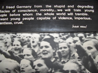 The actual quote on the plaque at Auschwitz is “I freed Germany from the stupid and degrading fallacies of conscience, morality...We will train young people before whom the whole world will tremble. I want young people capable of violence, imperious, relentless, cruel.” Photo of the plaque at Auschwitz